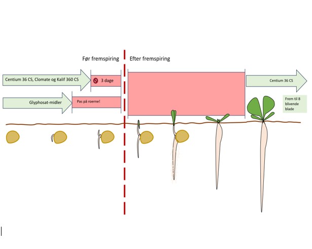 - Før fremspiring kør med 0,05 - 0,1 l/ha afhængig af jordtype.