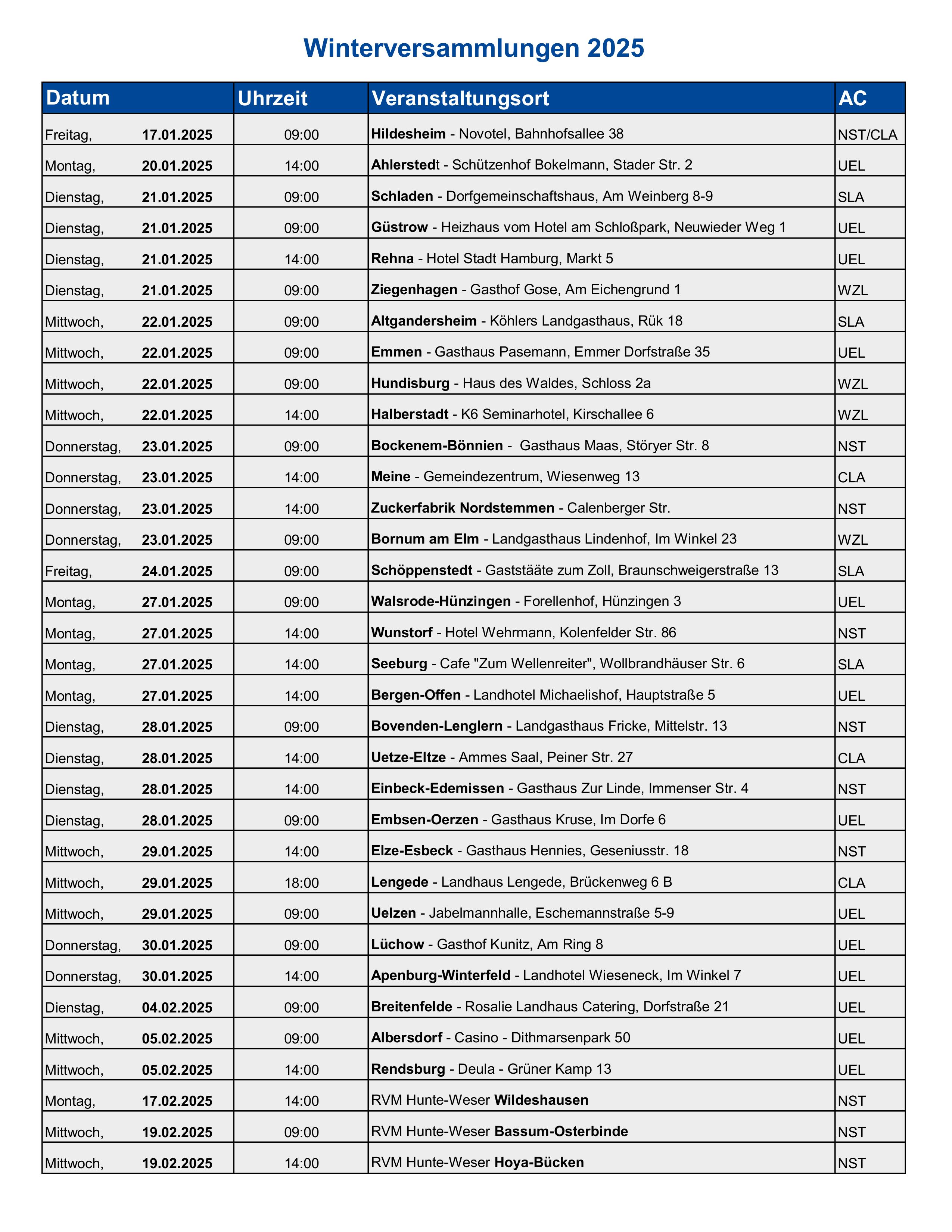 Auch im Jahr 2025 laden wir Sie wieder herzlich zu den regionalen Winterversammlungen ein. Die Termine für Ihre Region finden Sie nachfolgend: