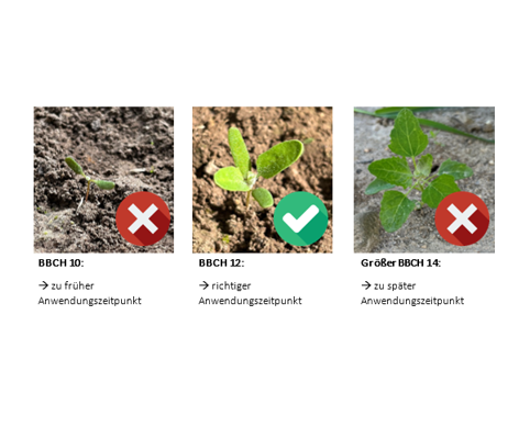 Die erste Applikation von CONVISO® ONE erfolgt später als bei konventionellen Zuckerrüben, der Weiße Gänsefuß (oder ein anderes Leitunkraut) sollte das 2-Blattstadium erreicht haben.