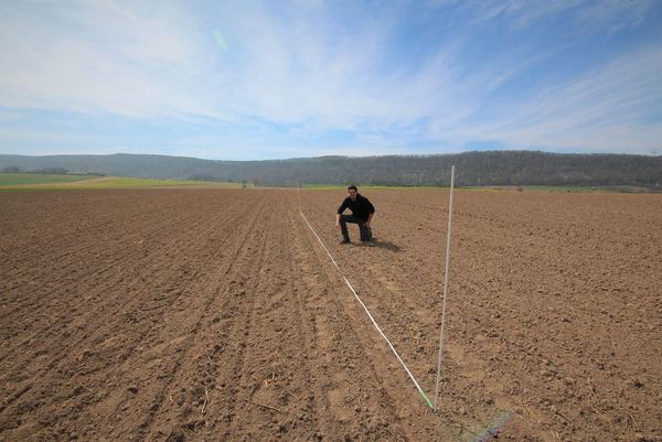 Auf einigen Flächen sind bereits erste Rübenkeimlinge durch die Oberfläche gestoßen. Wenn Sie Ihren Feldaufgang ermitteln möchten, legen Sie einfach eine Zählstrecke in Ihrem Bestand an. Dazu messen Sie eine Fläche von 10 m² aus. Bei einer 45er Reihenweite müssen Sie dazu zwei Reihen mit einer Länge von 11,11 m abschreiten und die darin befindlichen aufgelaufenen Rüben zählen. Dann multiplizieren Sie diese Zahl mit 1000 und Sie erhalten Ihre Bestandesdichte pro Hektar.