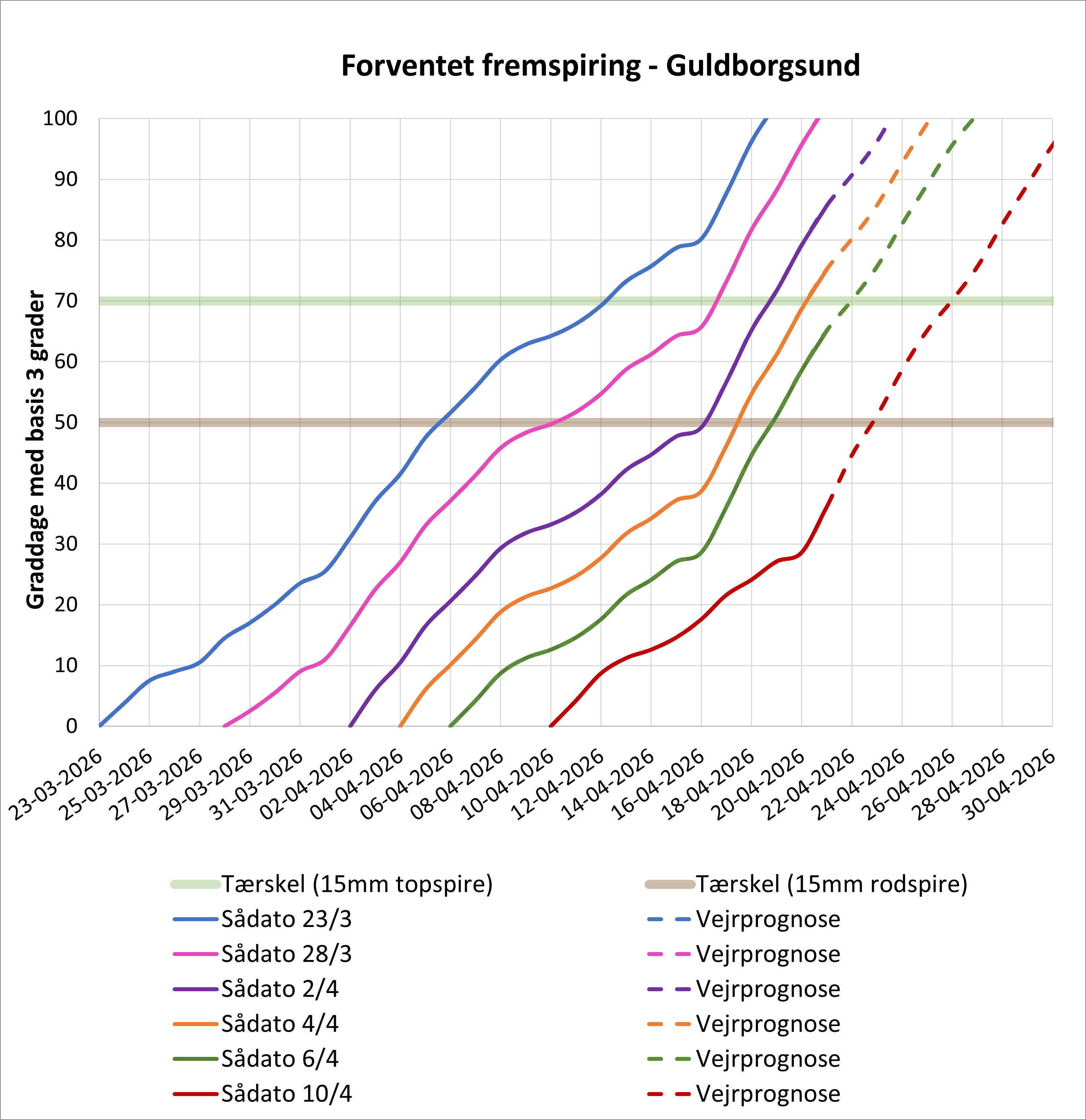 Derudover vises fem linjer, som repræsenterer fem forskellige sådatoer. De fuldt optrukne linjer er baseret på målte temperaturer, mens de stiplede linjer er beregnet ud fra den kommende vejrprognose fra DMI.