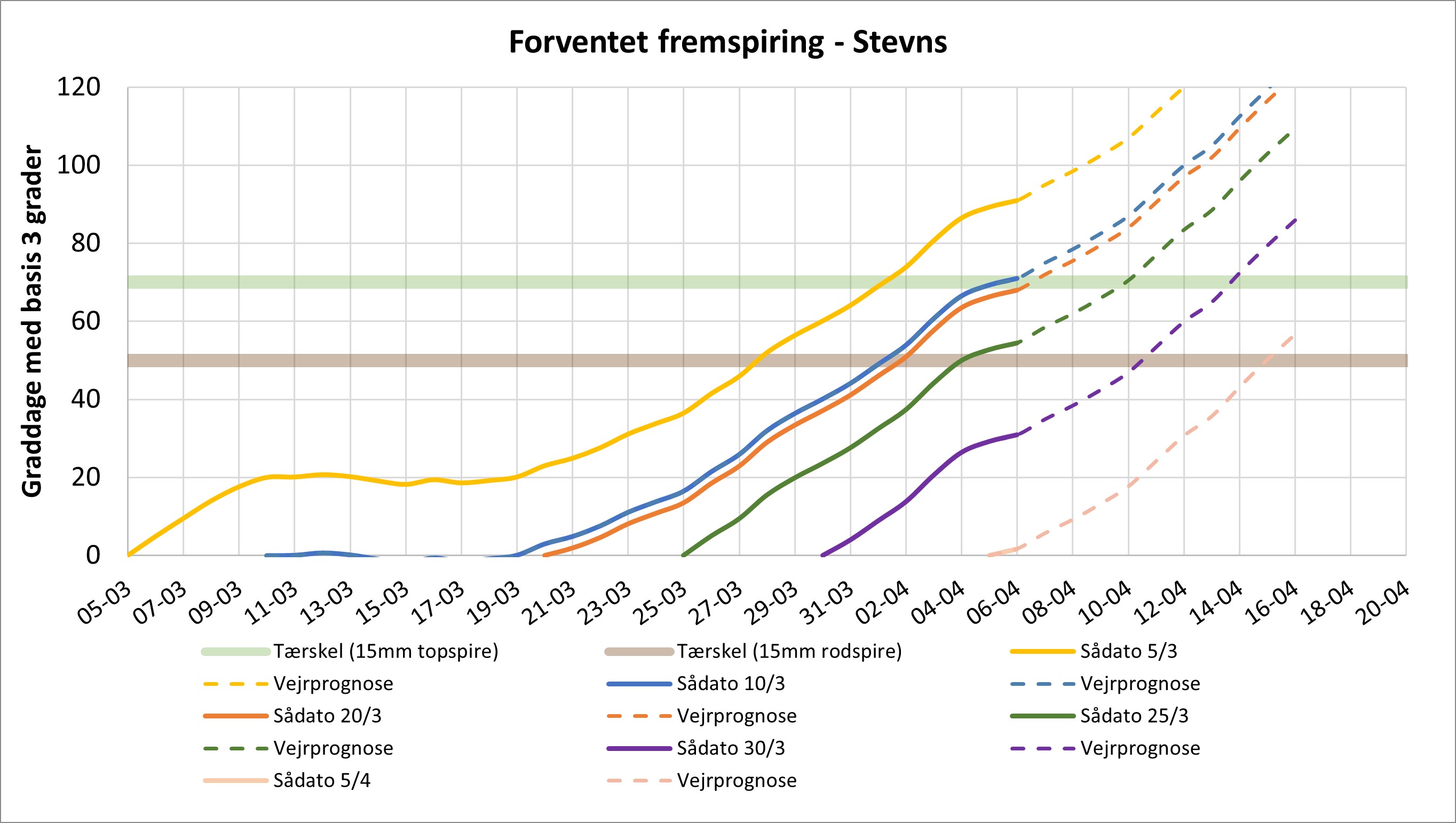Desuden ses seks linjer, for seks forskellige sådatoer. De fuldt optrukne linier er fra målte temperaturer, og de stiplede linier er på basis af kommende vejrprognose fra DMI.