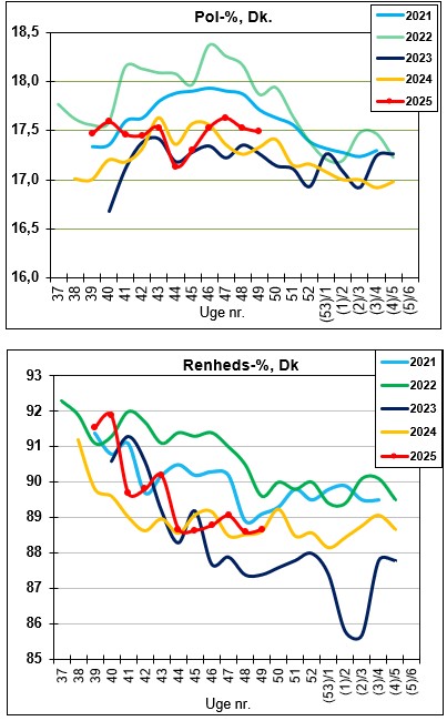 I nedenstående kurver vises pol-% og renheds-% for de sidste fem år.