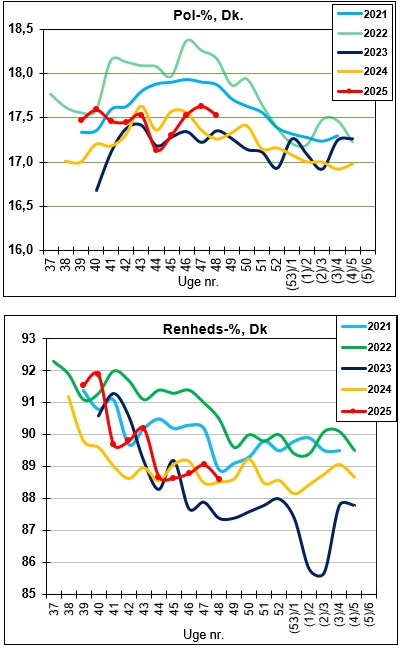 Renhed og sukkerprocent holder sig på et stabilt niveau. Roekvaliteten er fortsat god.
