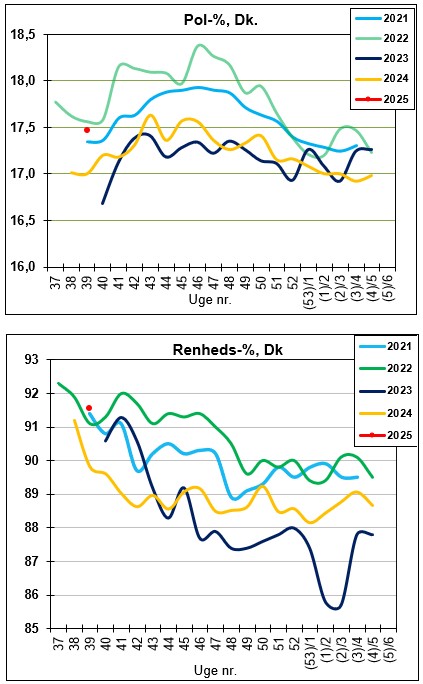 I nedenstående kurver vises pol-% og renheds-% for de sidste fem år.
