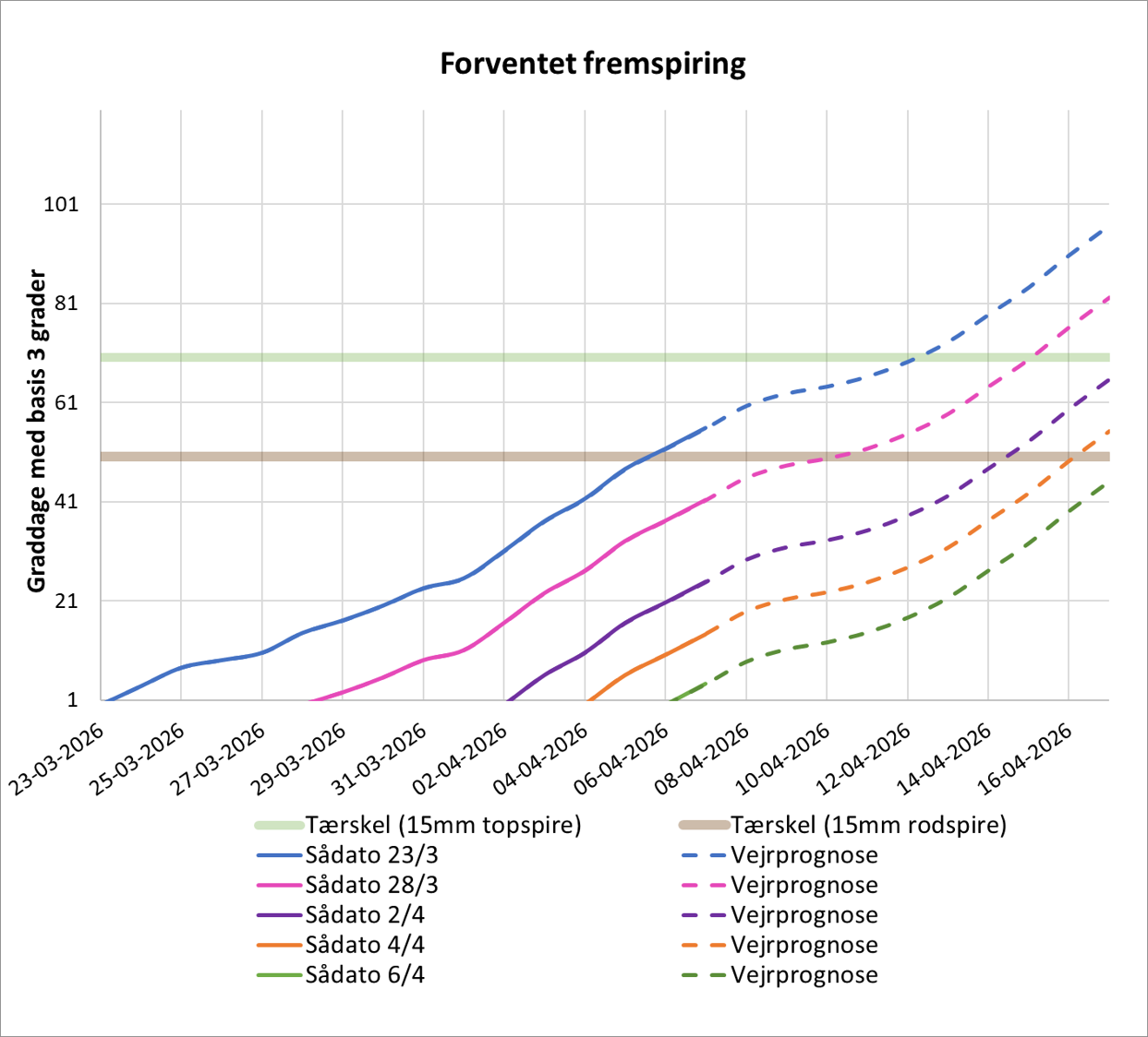 Derudover vises fem linjer, som repræsenterer fem forskellige sådatoer. De fuldt optrukne linjer er baseret på målte temperaturer, mens de stiplede linjer er beregnet ud fra den kommende vejrprognose fra DMI.