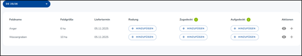 Die verschiedene Tätigkeitsdokumentationen für Ihr jeweiliges Feld können Sie über den Button „+ Hinzufügen“ in der jeweiligen Spalte angeben. Das System erkennt automatisch, ob Sie eine Meldung als Selbstabdecker durchführen oder eine Bestellung der Mietenpflege durch einen Dienstleister beauftragen. Selbstabdecker müssen zudem ein Foto bei der Meldung hochladen.