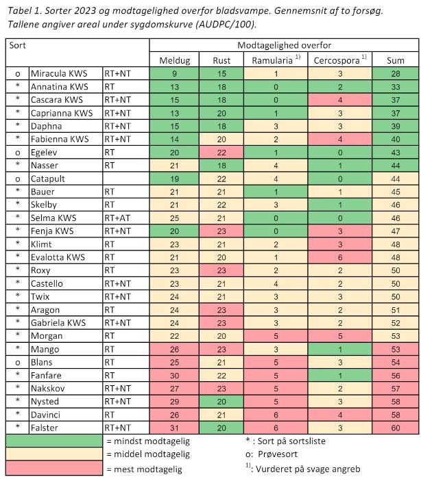 Der er forskelle mellem de enkelte sorters modtagelighed for bladsvampe. Alle sorter angribes dog af bladsvampe. Se nedenstående skema, som er opgjort efter NBR´s sortsvurderinger i 2022 for meldug, rust, ramularia og cercospora: